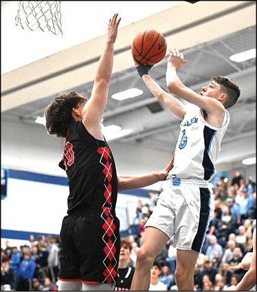 MONTPELIER FRESHMAN … CJ Fidler tries to finish at the rim during Friday night’s win over Hilltop. VIEW 106 PHOTOS OF THIS CONTEST FOR FREE AT WWW.THEVILLAGEREPORTER.COM